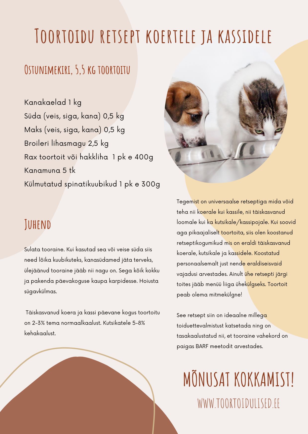 Koertele mõeldud retseptidest valmib korraga 10 kg ja kassidele 5 kg toortoitu.